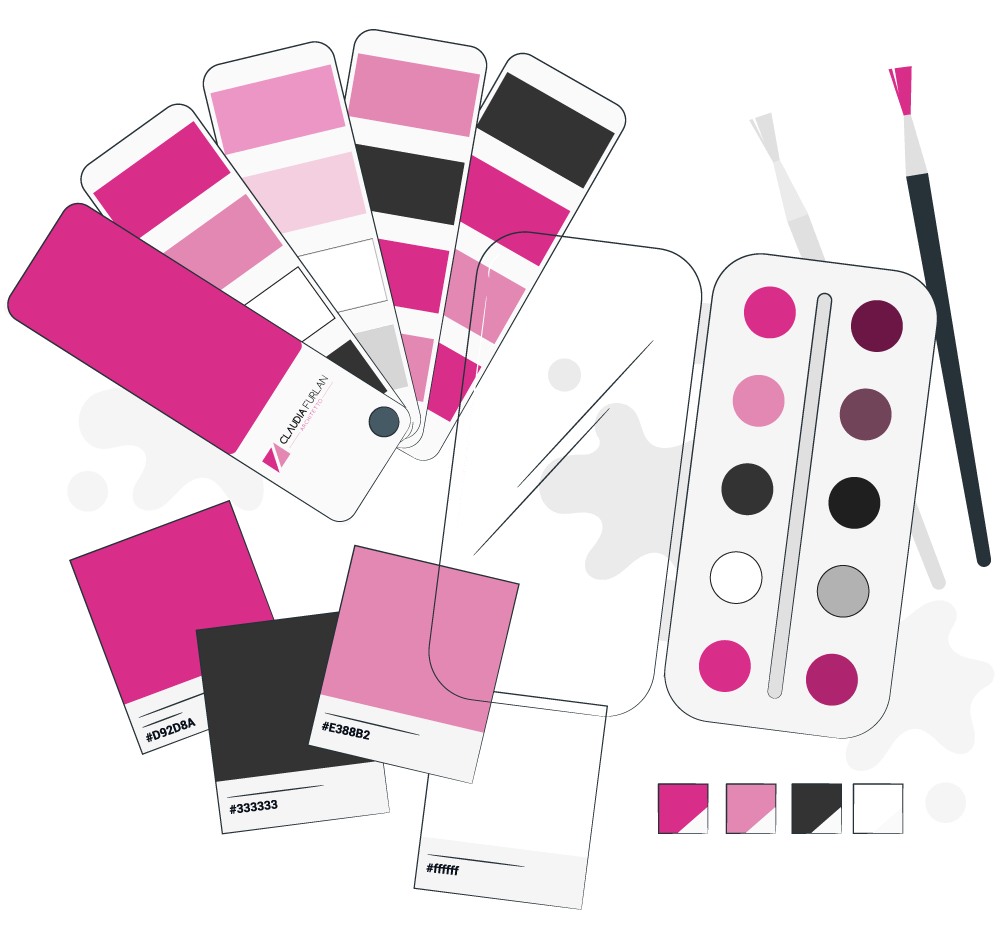 La palette cromatica nasce direttamente dal logo, giocando sulle tonalità vibranti del Fucsia e del Rosa in contrasto con la pulizia del Bianco. Se il bianco dona luce e spazialità ai progetti, le sfumature rosate vengono utilizzate strategicamente per evidenziare i dettagli chiave e rendere l'esperienza di navigazione accogliente e mai fredda.
